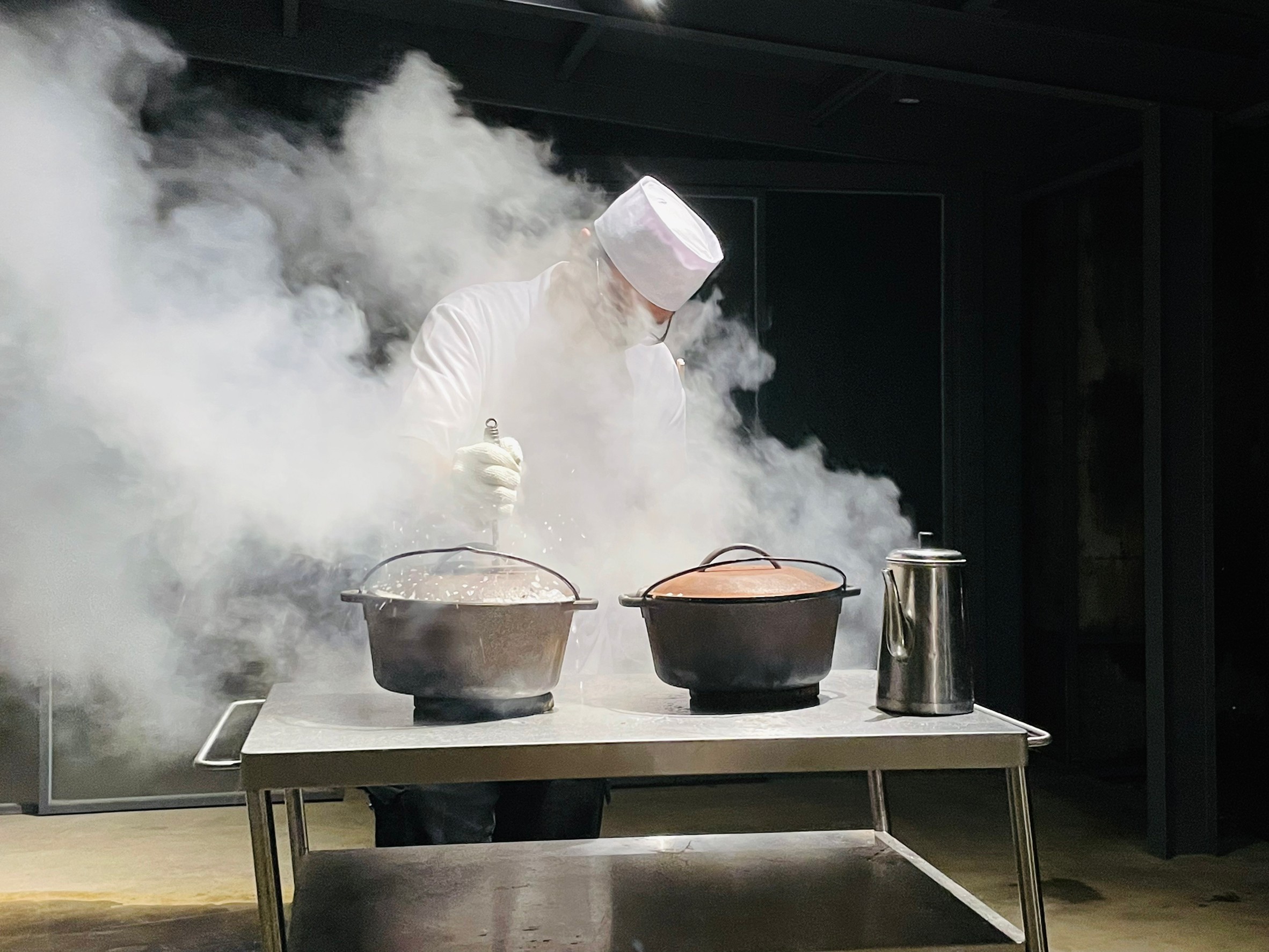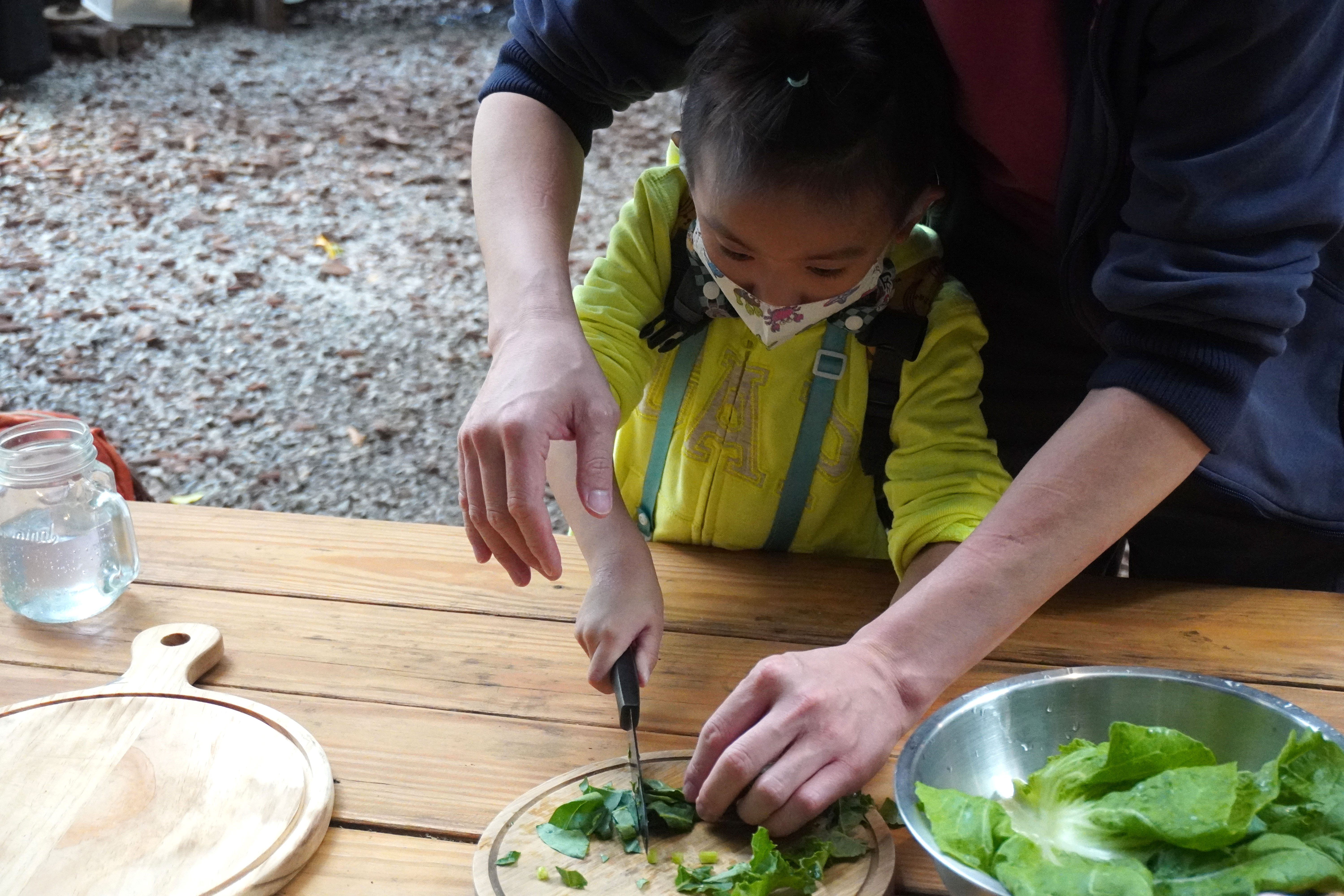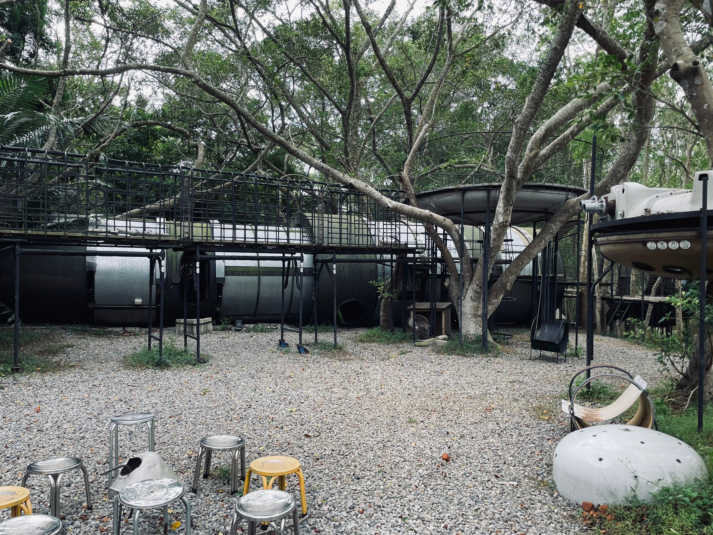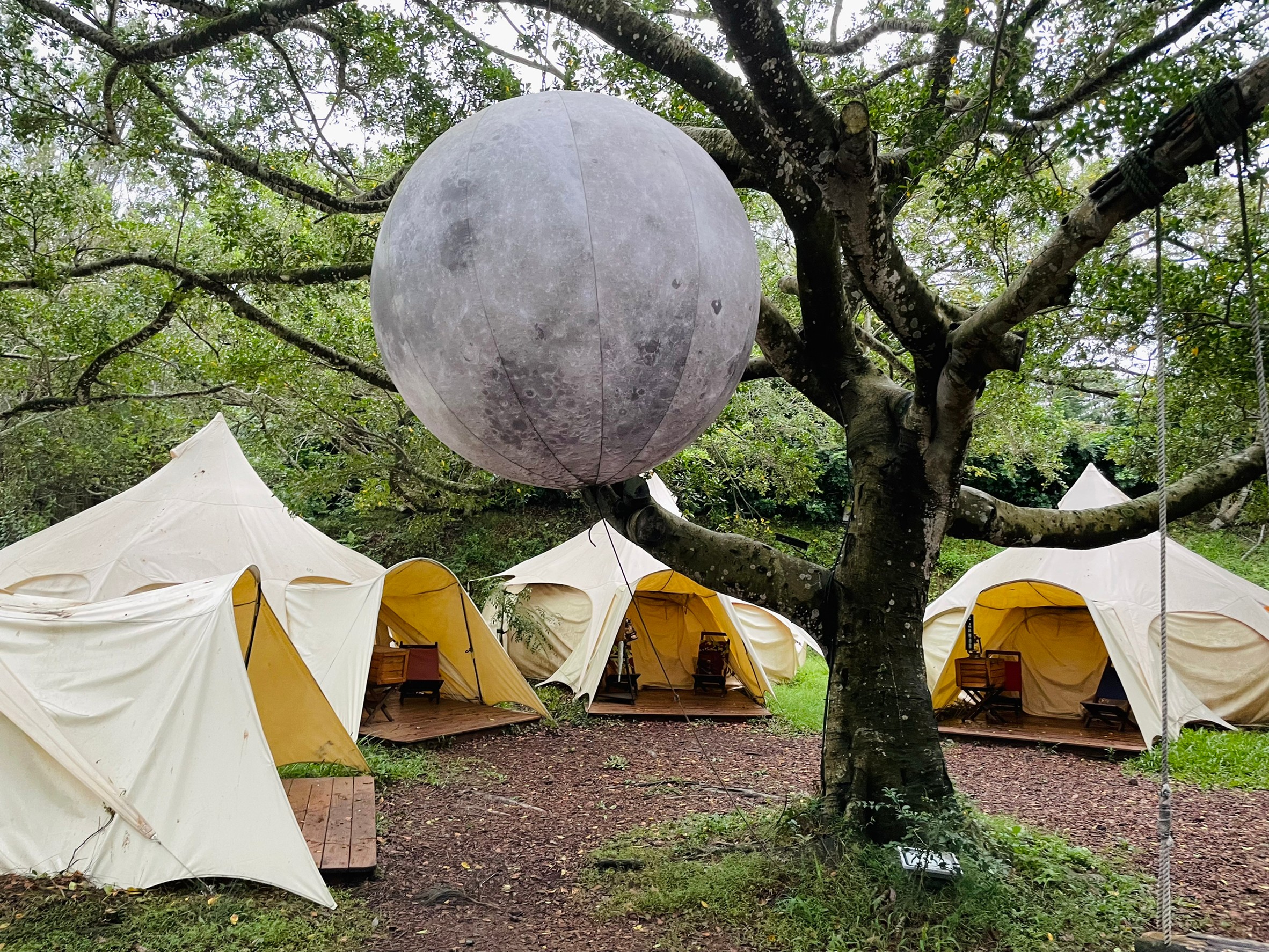 我們看牛喝水、聽羊猛咩、藍染方巾,在群樹包圍的野地廚房內手作野菜蔬餅、沖煮咖啡,在似藝術品的建築物內中的星球餐桌大啖美食,在燈光音效十足的樹林中太空漫遊,在一間佈置得比一間還浮誇的帳篷內滾來滾去,最後深夜在溫馨的客廳帳內玩著桌遊、喝著小酒跟身邊的人說說體己話。
