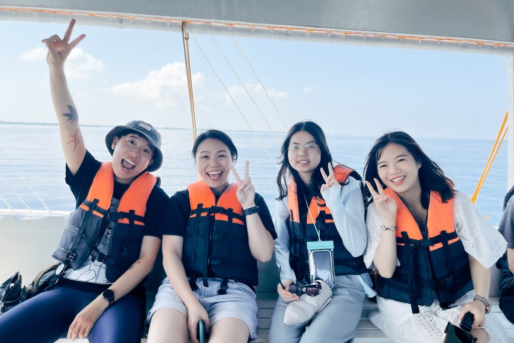 搭著大船換小螃蟹船前往資生堂島,天氣好海又藍,